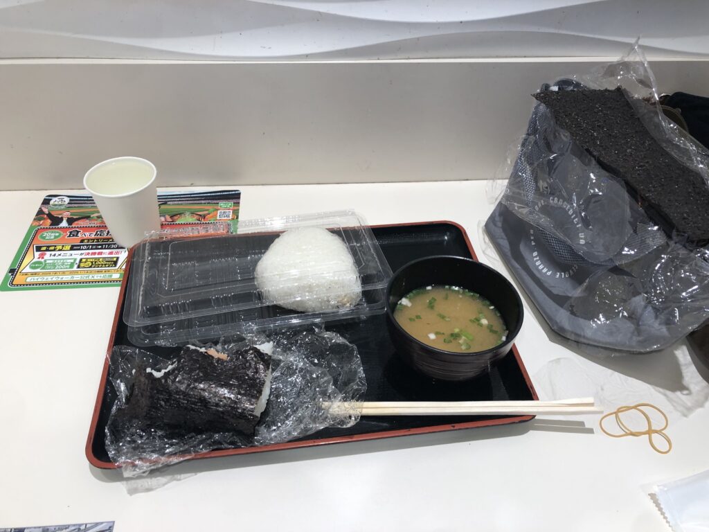 妻が総勢3名分のおにぎりを作ってくれたので、それをフードコートの味噌汁と共に頂きました。
