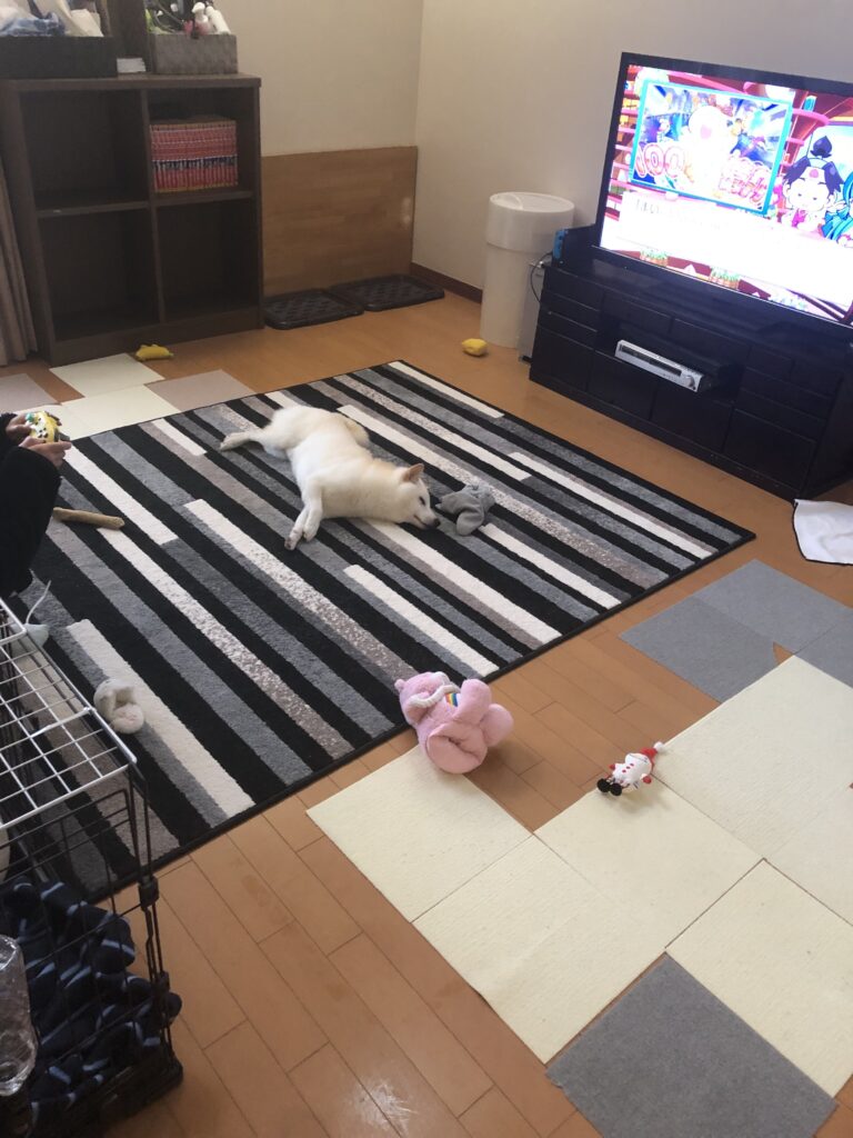 すると、すでに朝ごはんを済ませた豆柴の ”おこげ” がリビングのど真ん中を陣取り、のんびりリラックス。