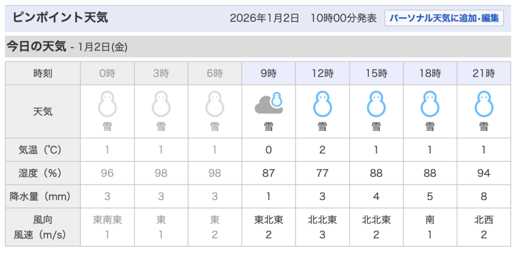 今日の夜には、少し強めの雪が降る可能性があるようで、さらに積雪が増える模様。